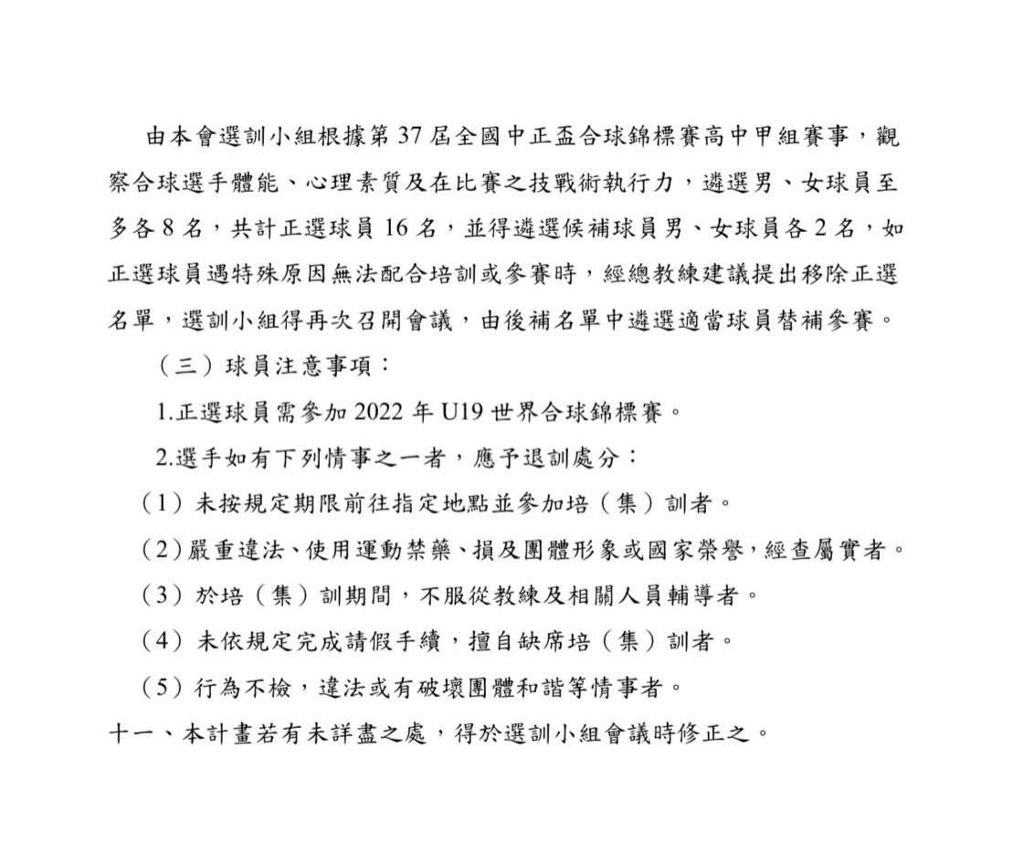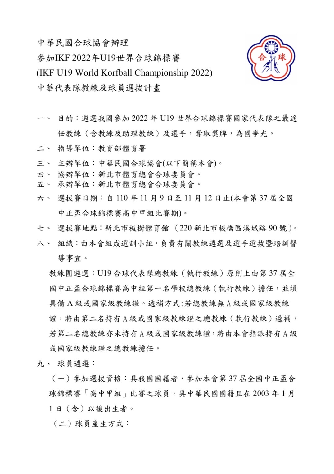 2022 U19 世界合球錦標賽-教練及選手選拔計畫