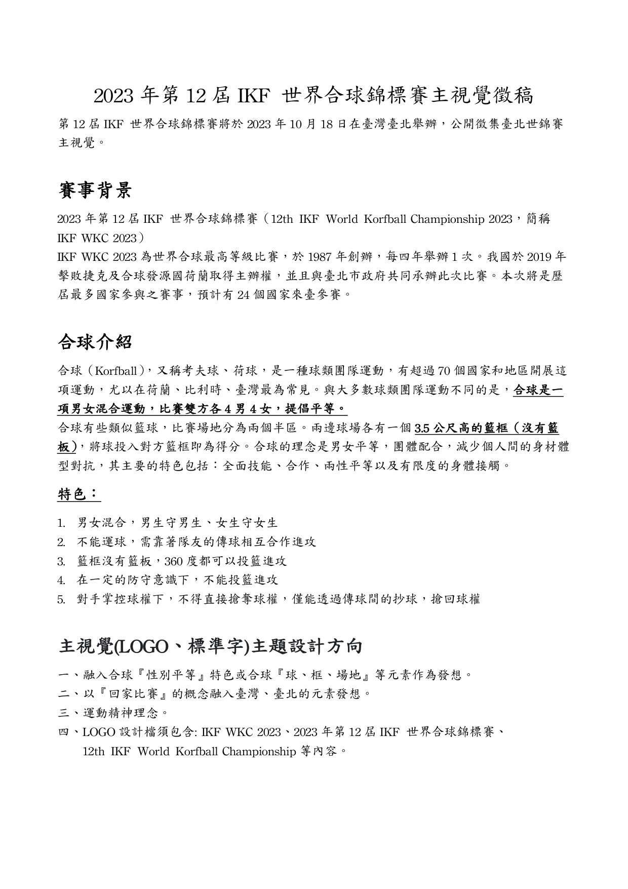 四、LOGO 設計檔須包含: IKF WKC 2023、2023 年第 12 屆 IKF 世界合球錦標賽、 12th IKF World Korfball Championship 等內容。